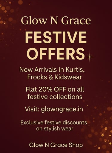 “Glow N Grace — your destination for trendy Kurtis, frocks & kidswear.We bring new collections every week with affordable prices & festive offers!”